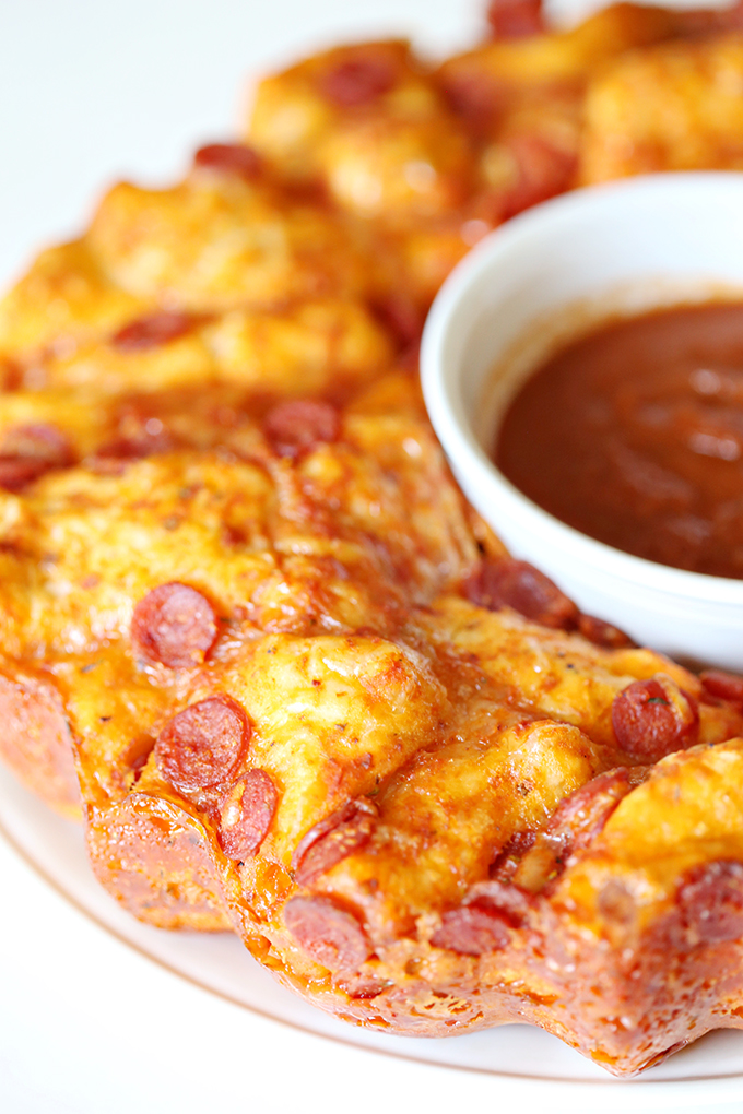 This Pepperoni Pizza Monkey Bread is mouthwatering! Find the recipe here at See Vanessa Craft.